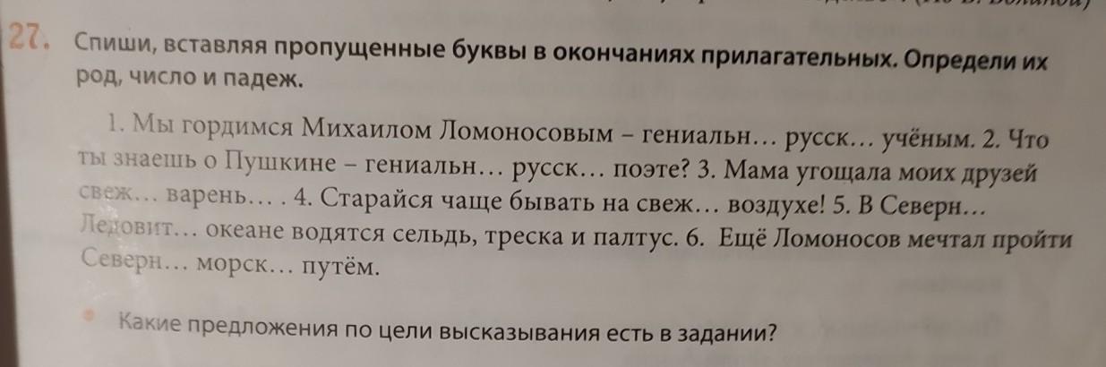 Мы гордимся Михаилом Ломоносовым - гениальным ( м.р, ед.ч, т.п) русским (м.р, ед.ч, т.п) учёным. 2) Что ты знаешь о Пушкине- гениальном( м.р, ед.ч, п.п) русском(м.р, ед.ч,п.п) поэте? 3) Мама угощала моих друзей свежим ( ср.р, ед.ч, т.п) вареньем. 4) Старайся чаще бывать на свежем( м.р, ед.ч, п.п) воздухе. 5) В Северном ( м.р, ед.ч, п.п) Ледовитом ( м.р, ед.ч, п.п) океане водятся сельдь, треска и палтус. 6) Ещё Ломоносов мечтал пройти северным ( м.р, ед.ч, т.п) морским(м.р, ед.ч, т.п) путём.