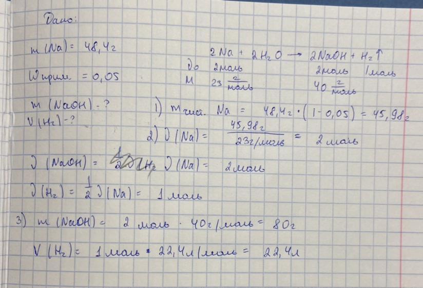 В воде растворили 48,4 г. натрия содердащего 5% примесей. Найдите массу образовавшегося гидроксида натрия и объём выделевшегося водорода ДАЮ 100 БАЛЛОВ