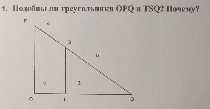 Да,они подобны.Первый признак подобия. Если два угла одного треугольника соответственно равны двум углам другого, то такие треугольники подобны. <ОРS=<TOP, < QTS=<TSQ.А также их стороны подобны. PS/TO= SQ/TQ=PQ/OQ=4/2=6/3=10/5=2.Коэффициент подобия.