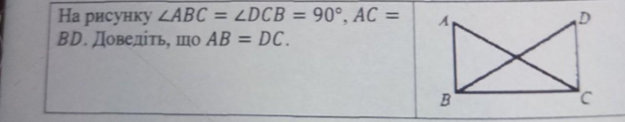Прямокутні трикутники ABC і DCB рівні по катету і гіпотенузі, адже згідно з умовою AC=BD i BC загальний катет трикутників ABC і CD, а значить катети AB i CD теж рівні.