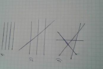 Проведите четыре таких прямых, которые: 1) не пересекаются; 2) пересекаются в трех точках; 3) пересекаются в 6 точках.