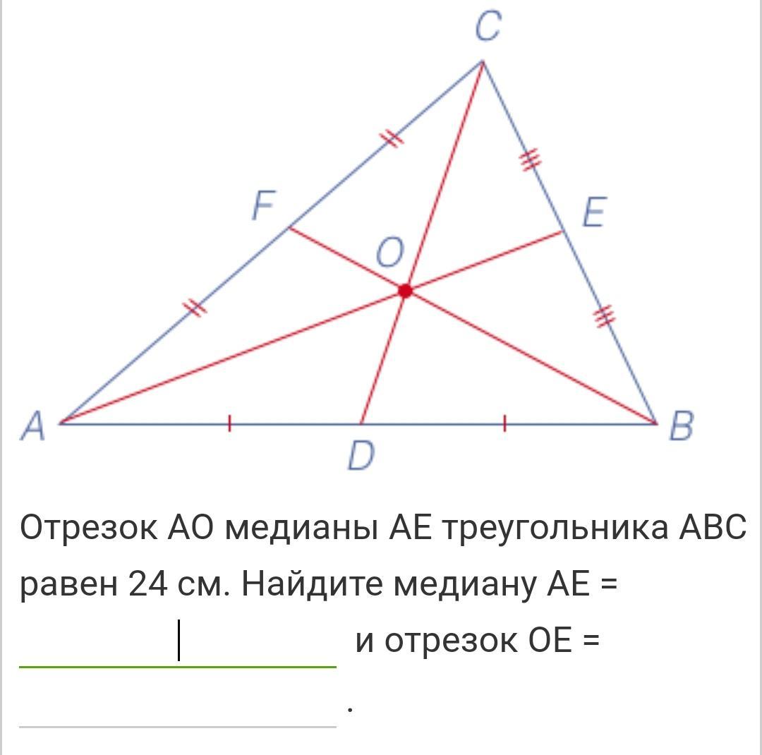 Медиана точкой пересечения медиан делится в отношении 2:1 начиная от вершины.