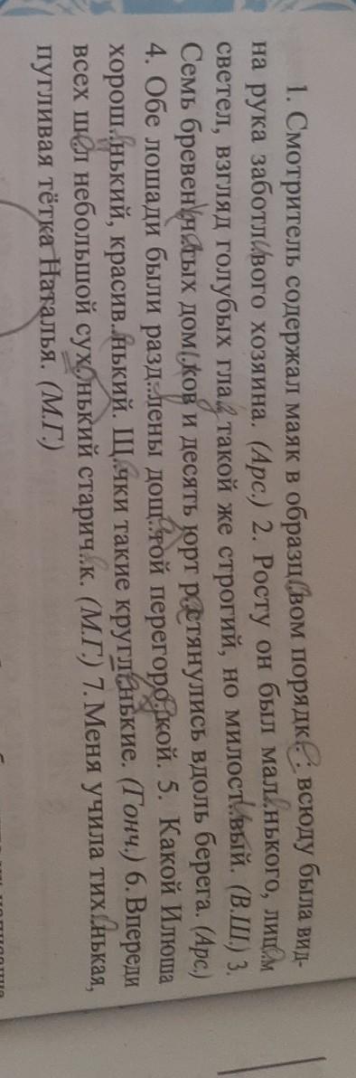 1Смотриель содержал маяк в образцовом порядке: всюду было видна рука заботливого хозяина 2 Росту он был маленького, лицам светел, взгляд голубых глаз такой же строгий, но милостивый.3 Семь бревенчатых домиков и десять юрт растянулись вдоль берега .4 Обе лошади были разделены дощьтой перегородкой. 5 Какой Илюша хорошенький, красивенький. Щёчки такие кругленькие.6 Впереди всех шел небольших сухонький старичок.7 Меня учила тихонькая, пугливая тетка Наталья