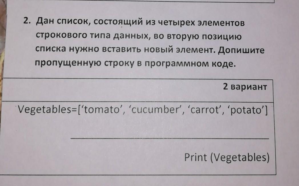 2. Дан список, состоящий из четырех элементов строкового типа данных, во вторую позицию списка нужно вставить новый элемент. Допишите пропущенную строку в программном коде. 2 вариант Vegetables=['tomato', 'cucumber, 'carrot', 'potato') Print (Vegetables)
