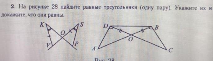VKO= OSP , т.к. там есть перекрёстные углы , а они равны. так же угол К = углу S. так же там раны стороны КV и SP. ( 2 признак равенства )