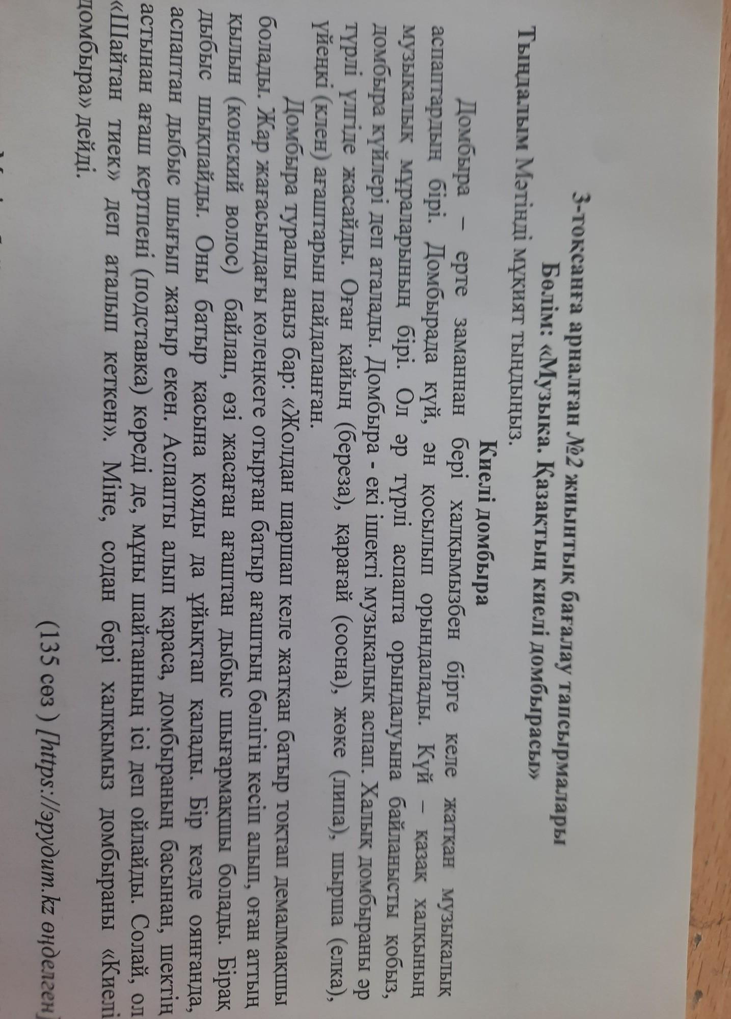 2-тапсырма. Мәтіннің не туралы екенін анықтаңыз. А) Ұлттық аспап туралы B) Күй өнері туралы C) Күйші туралы Д) Шеберлер туралы