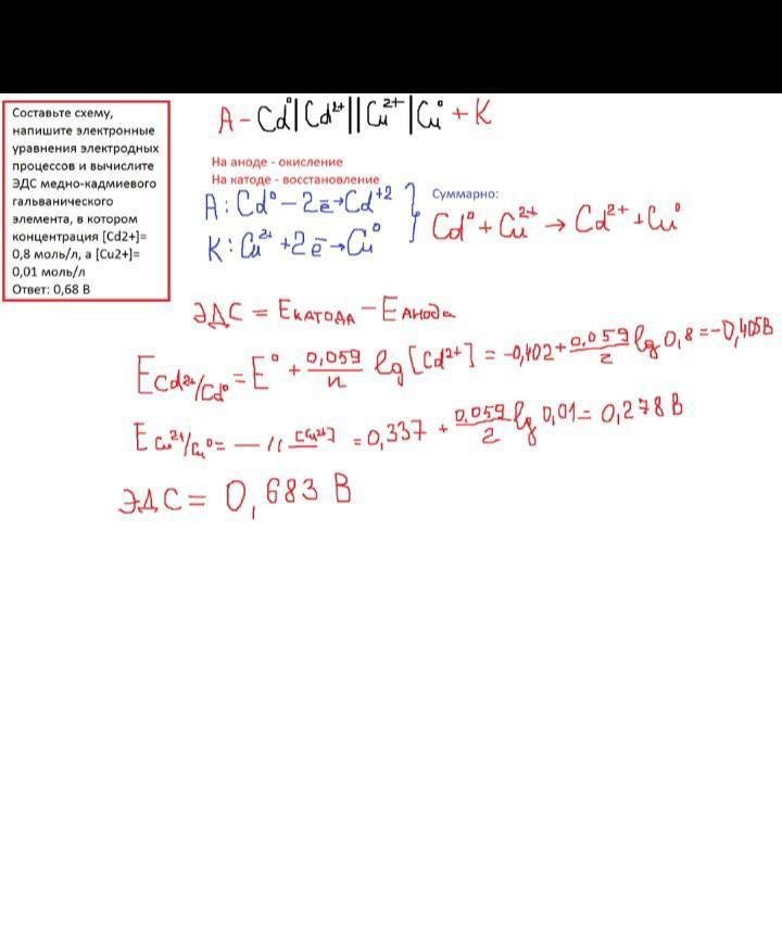 Составить схему, привести уравнения электродных процессов и вычислить ЭДС концентрационного гальванического элемента, состоящего из медных электродов, опущенных в растворы СuSO4 с концентрациями 0,01 и 0,1 моль/л.