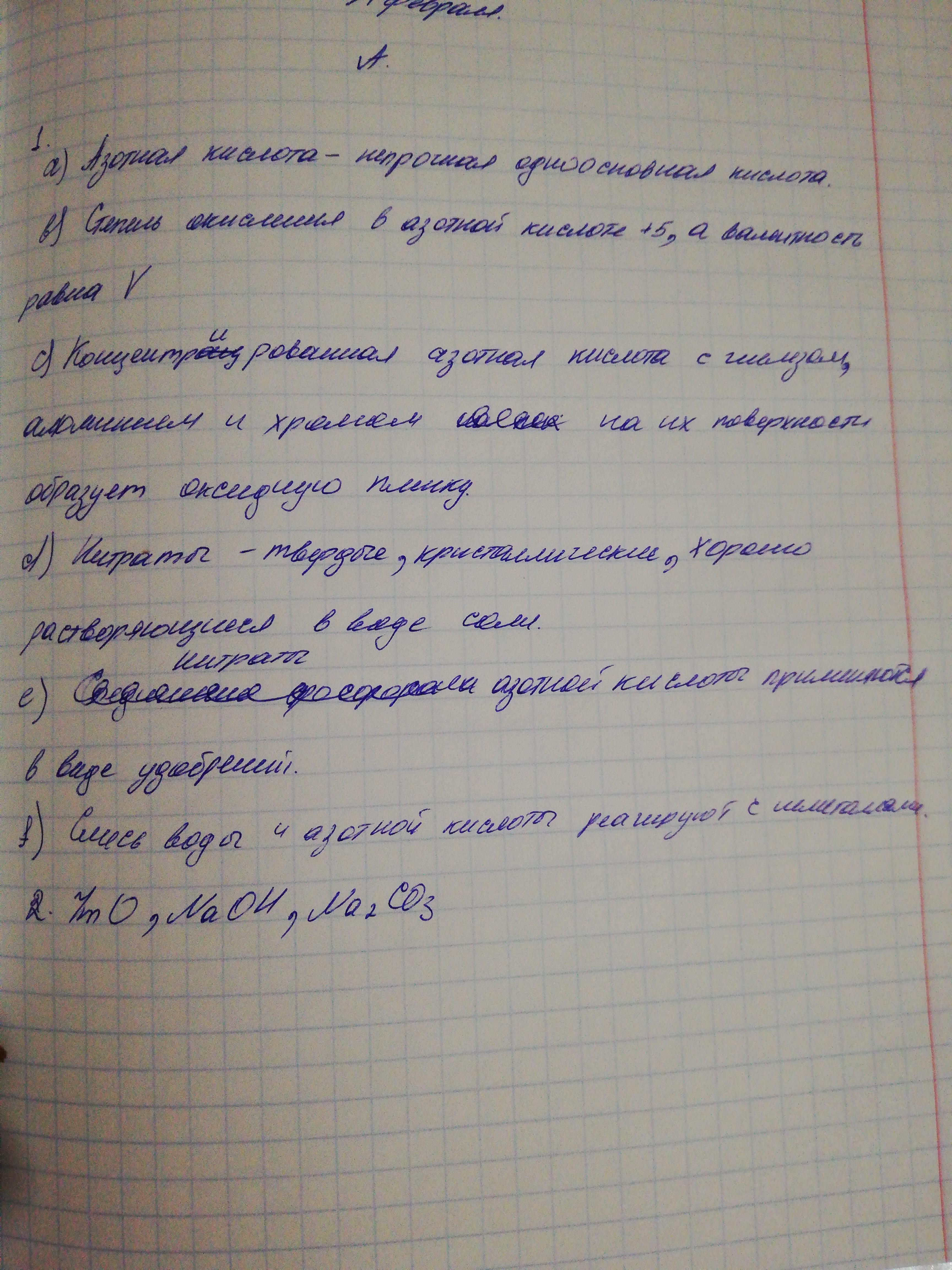 1. Дополните текст. а) Азотная кислота . кислота. b) Степень окисления в азотной кислоте +5, а валентность равна ... с) Концентрированная азотная кислота с железом, на их поверхности образует оксидную пленку. d) . твердые, кристаллические, хорошо растворяющиеся в воде соли. е). азотной кислоты применяются в виде удобрений. f) азотной кислоты реагируют с неметаллами. ...