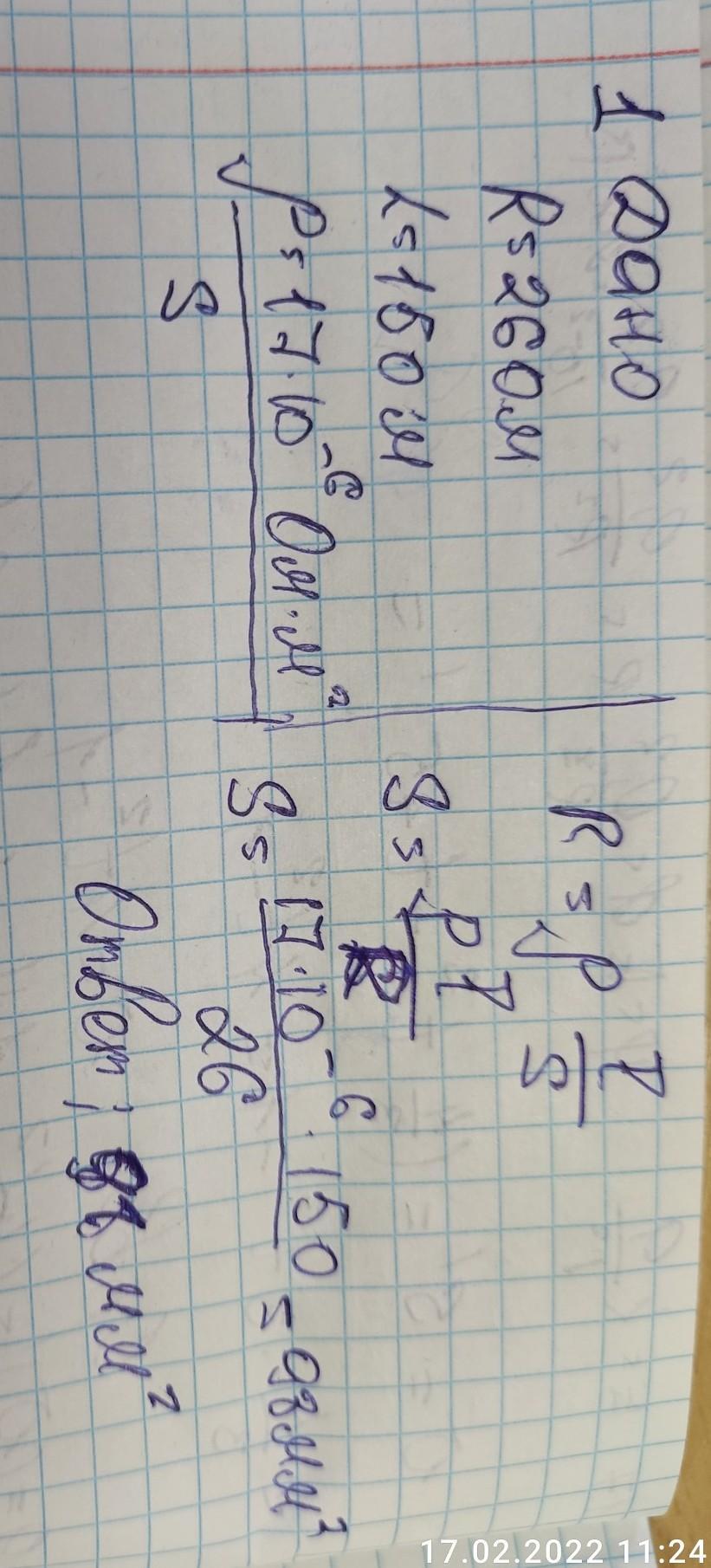 1. Каким должно быть сечение медной проволоки, чтобы ее сопротивление составило 26 Ом при длине 150м. Удельное сопротивление меди 0,017(Ом*〖мм〗^2)/м