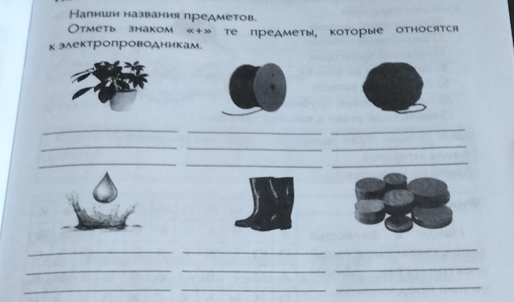 Напиши названия предметов. Отметь знаком те предметы, которые относятся к электропроводникам.