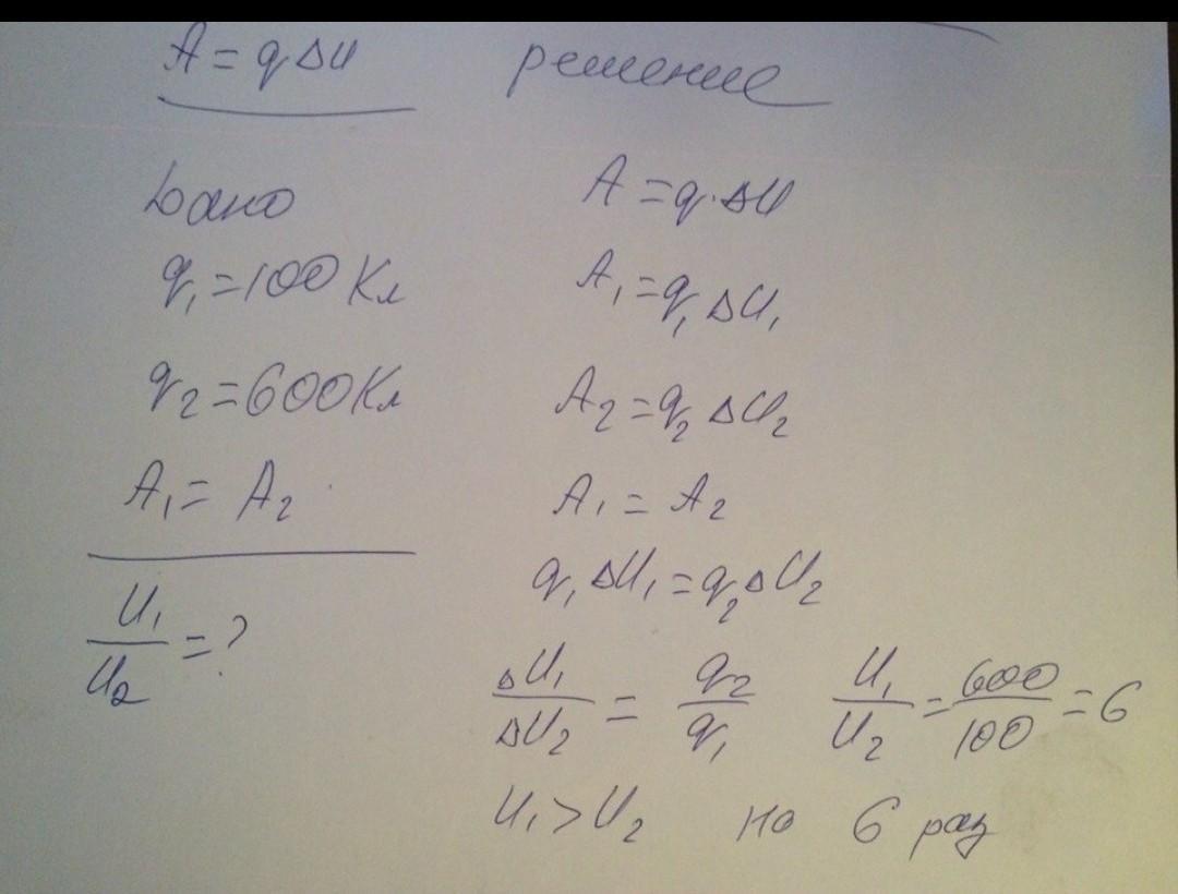 На одном участке цепи при перемещении по нему заряда 100 Кл была совершена такая же работа, как и при перемещении заряда 600 Кл на другом участке. На каком участке напряжение больше и во сколько раз? С объяснением задачи