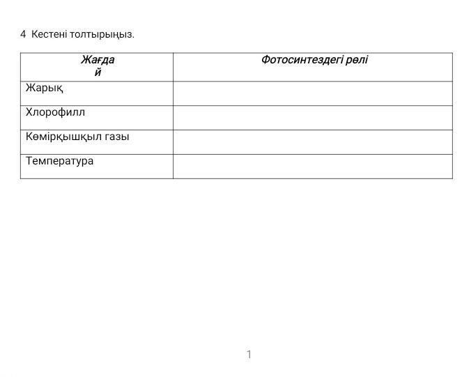 Кестені толтырыныз. Жагдай Фотосинтездегі роли Жарык Хлорофилл Комиркышкыл газы Температура