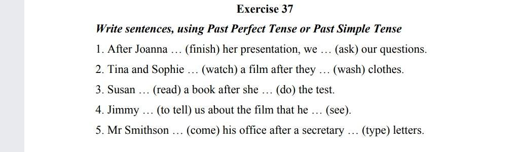 1.finished,asked2.watched.washed.3.read,done.4.told,seen.5.come,type