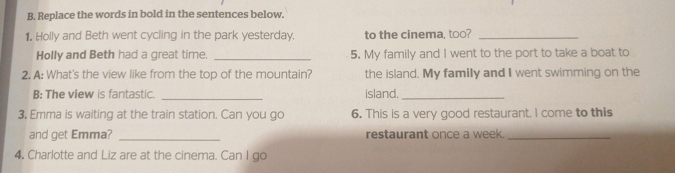 B. Replace the words in bold in the sentences below. 1. Holly and Beth went cycling in the park yesterday Holly and Beth had a great time 2. A: Whats the view like from the top of the mountain? B: The view is fantastic 3. Emma is waiting at the train station Can you go and get Emma? 4. Charlotte and Liz are at the cinema. Can I go to the cinema too? 5. My fam y and I went to the port to take a boat to the island. My family and I went swimming on the sand 6. This is a very good restaurant come to this restaurant once a week