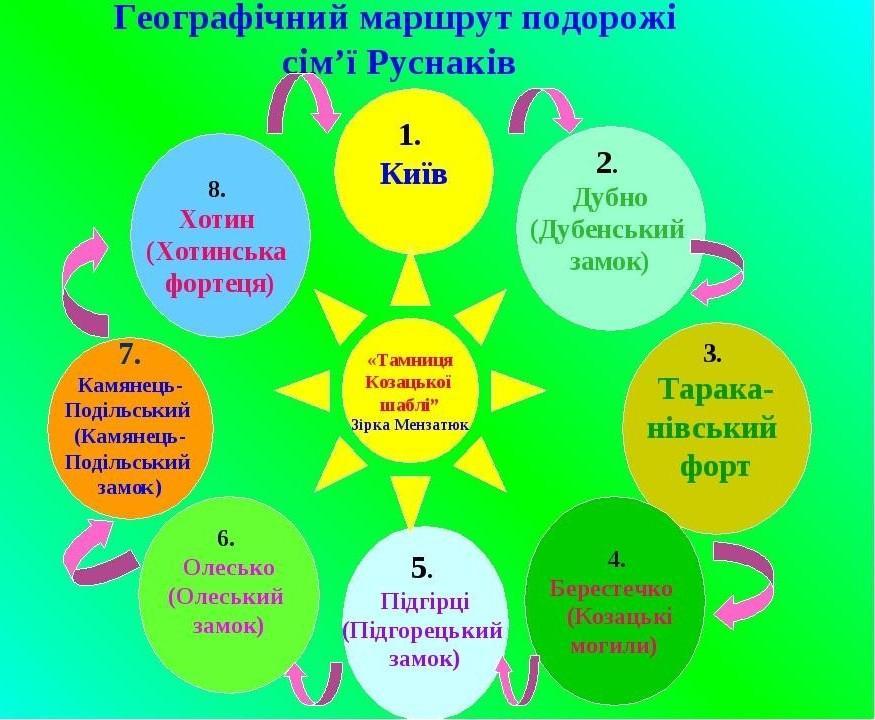 Скласти маршрут подорожі родини Руснаків (Таємниця козацької шаблі) з коротким коментарем перебігу подій