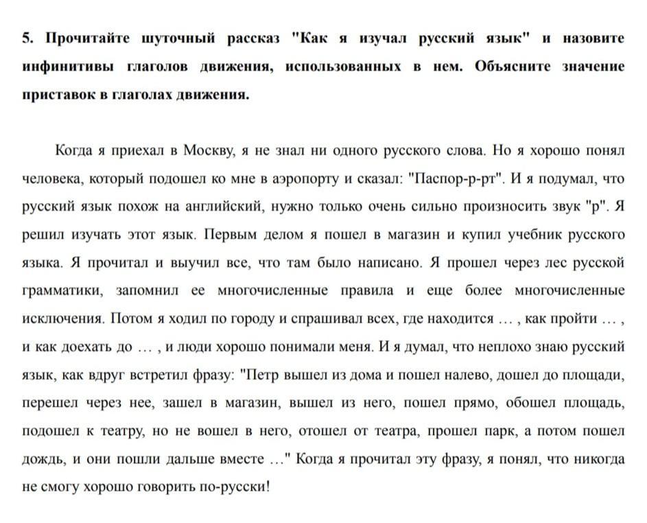 Назовите инфинитивы глаголов движения использованных в нём Объясните значение приставок в глаголах движения. Когда я приехал в Москву я не знала ни одного русского слова.но я хорошо понял человека который подошёл ко мне в аэропорт и сказал паспорт я подумал что русский язык похож на английский нужно только очень сильно произносить звук \р\.Я решил изучать этот язык .Первым делом Я пошёл в магазин и купил учебник русского языка. Я прочитал и выучил всё что там было написано.Я прошёл через лес русской грамматике Запомни её многочисленные правила и ещё более многочисленные исключения. Потом я ходил по городу и спрашивал всех Где находится Как пройти и как доехать до и люди хорошо понимали меня.И я думал что неплохо знаю русский язык как бы друг встретил фразу Пётр вышел из дома и пошёл налево дошёл до площади прошёл через неё нашёл в магазин вышел из него пошел прямо обошёл площадь Подошёл к театру но не вышел в него отошёл от театра прошёл парк а потом пошёл дождь и они пошли дальше вместе.. Когда я прочитал эту фразу Я понял что иногда не самого хорошего говорит по-русски .