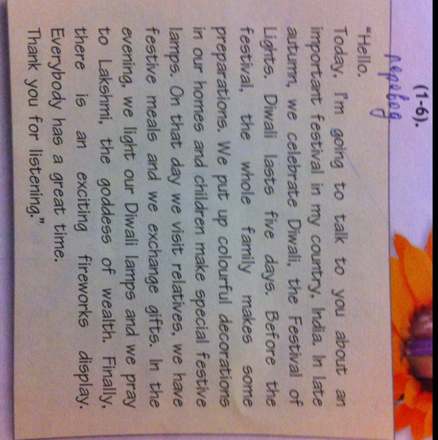 Сегодня я хочу поговорить с вами о важном фестивале в моей стране, Индии. В конце осени мы празднует Дивали,праздник огней. Дивали последние пять дней. Перед фестивалем,вся семья делает некоторые приготовления. Мы вешаем красочные украшения в наших домах и дети делают специальные праздничные лампы. в этот день мы навещаем родственников,у нас есть фестивальные блюда и мы обмениваемся подарками. Вечером, мы зажигаем наши Дивали лампы и мы молимся,чтобы Лакшми, богиня фейерверка. В конце мы пускаем салюты. Все проводят хорошо время.