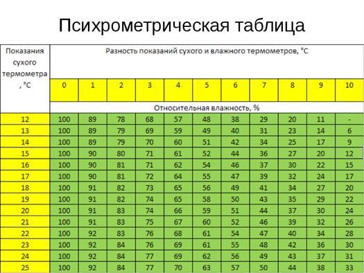По таблице разность показаний сухого и влажного термометров = 5°С