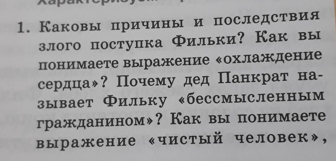 Характеризуем героев 1. Каковы причины и последствия злого поступка Фильки? Как вы понимаете выражение «Охлаждение сердца»? Почему дед Панкрат на- зывает Фильку «бессмысленным гражданином»? Как вы понимаете выражение «чистый человек»,