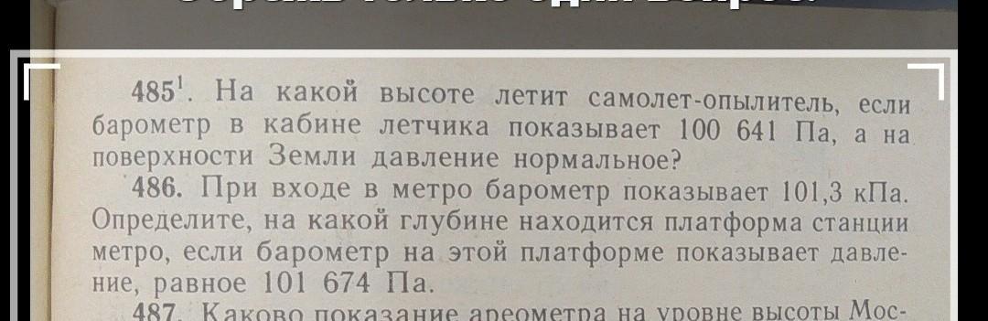 485". На какой высоте летит самолет-опылитель, если барометр в кабине летчика показывает 100 641 Па, а на поверхности Земли давление нормальное?
