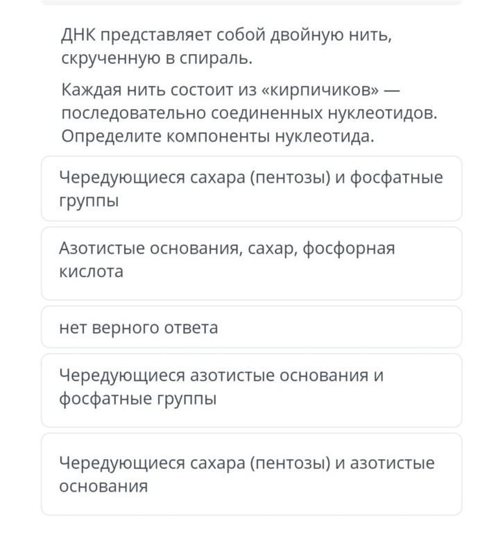 ДНК представляет собой двойную нить, скрученную в спираль. Каждая нить состоит из «кирпичиков» — последовательно соединенных нуклеотидов. Определите компоненты нуклеотида.