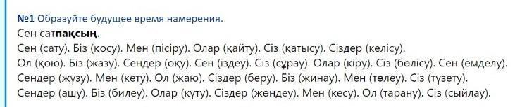 Ол қояды. Біз жазамыз. Сендер оқисындар. Сен іздейсін. Сіз сұрайсыз. Олар кіреді. Сіз бөлісесіз. Сен емделесін. Сендер жүзесіндер. Мен кетемін. Ол жаяды. Сіздер бересіздер. Біз жинаймыз. Мен төлеймін.Сіз түзетесіз.Сендер ашасындар.Біз билейміз.Олар күтеді.Сіздер жөндейсіздер.Мен кесемін.Ол таранады.Сіз сыйлайсыз