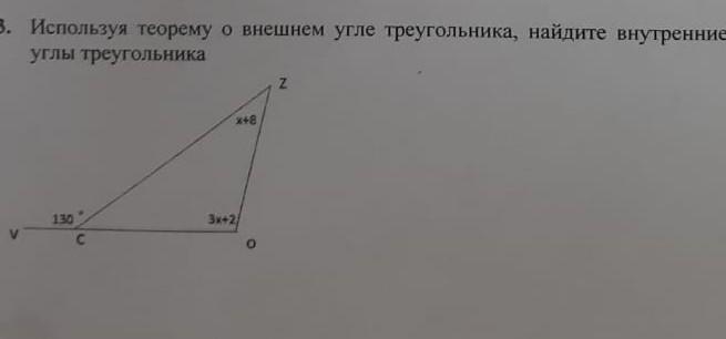 180-130=50 угол С, х+8+3х+2+50=180, 4х=120, х=30, 30+8=38 угол Z, 3*30+2=92 угол O