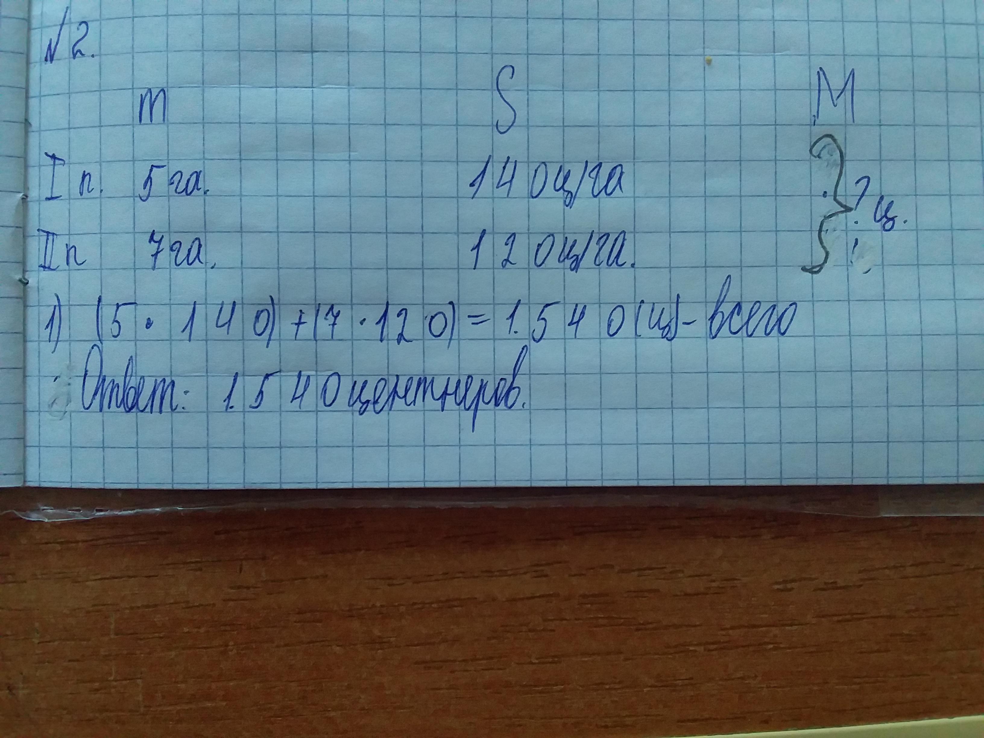 2 Я применяю формулы урожайности при решении задач. Реши задачу. Запиши формулу, которую применил. Урожайность помидоров, собранных с поля площадью 5 га равна 140 ц/га, а с поля площадью 7 га всего центнеров помидоров собрали с двух полей? 120 ц/га. Сколько всего собрали с двух полей пж фото в тетради а то не дам баллы!