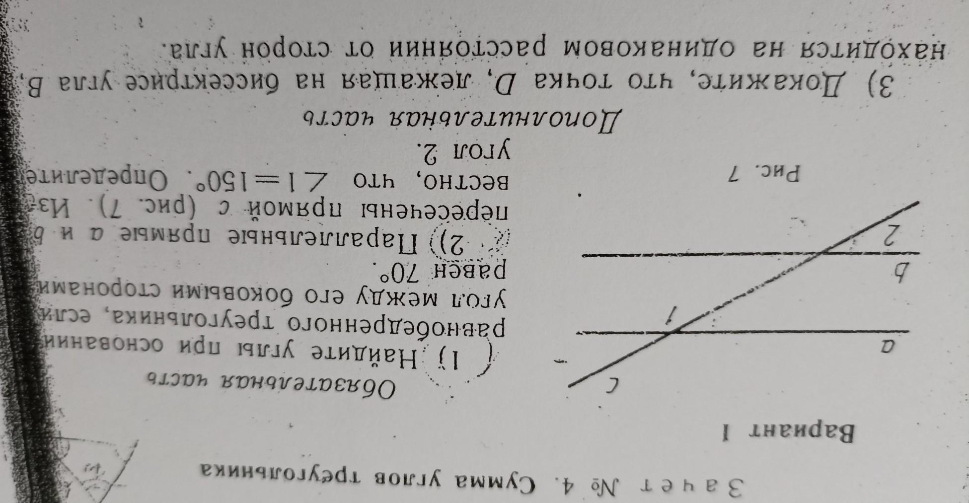 обязательная часть 1) Найдите углы при основании равнобедренного треугольника, если угол между его боковыми сторонами а Б равен 70°. 2); Параллельные прямые аи ба пересечены прямой с (рис. 7). Из вестно, что 21 = 150°. Определитет YT Рис. 7 угол 2. Дополнительная часть 3) Докажите, что точка D, лежащая на биссектрисе угла В, находится на одинаковом расстоянии от сторон угла.
