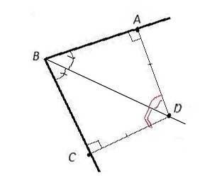 3) Расстояние от точки D (на биссектрисе) до стороны угла измеряется длиной перпендикуляра, опущенного из этой точки на сторону угла.
