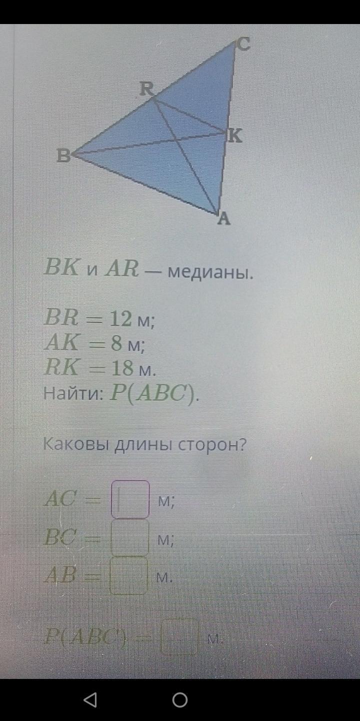 АС=2АК=16 м, ВС=2ВR=24 м; RК - средняя линия, АВ=2RК=36 м.