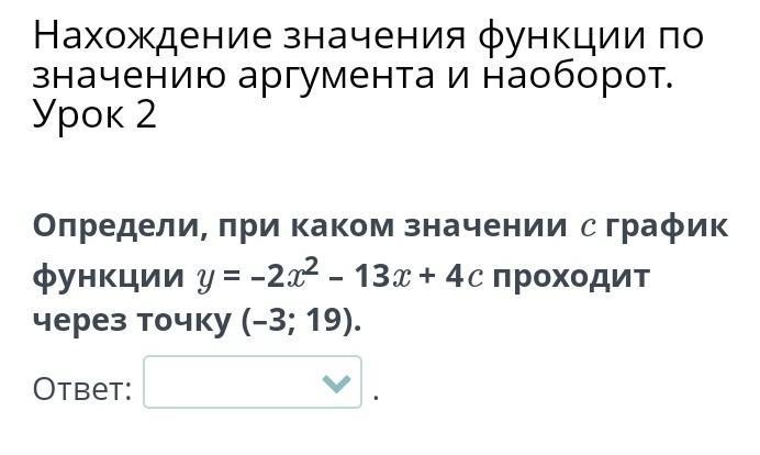 Определи, при каком значении с график функции y = -2x² - 13x + 4c проходит через точку (-3; 19).