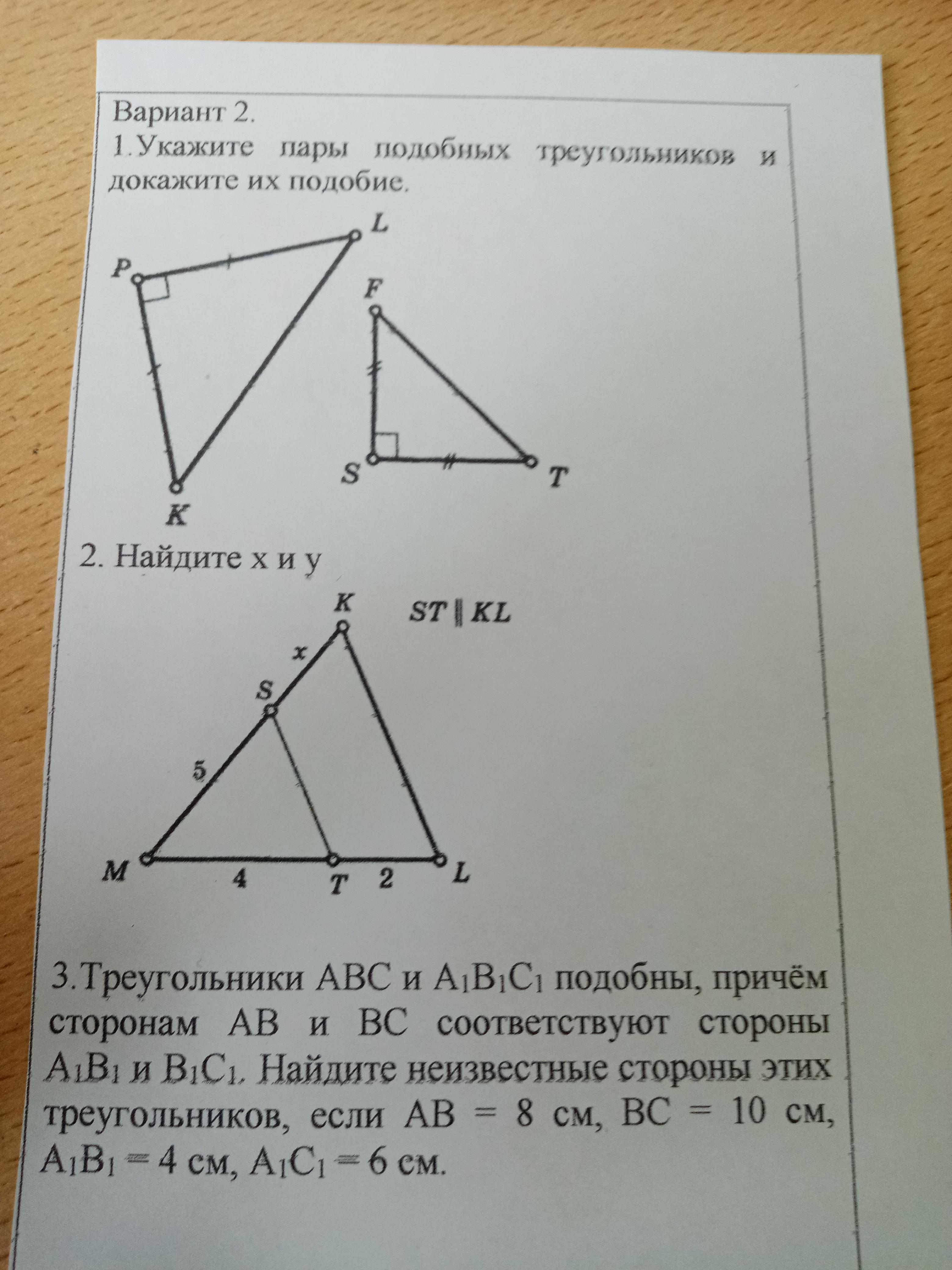 1) PLK ~ SFT, потому что они оба прямоугольные (<LPK = <FST = 90°) и равнобедренные (LP = PK, FS = ST)