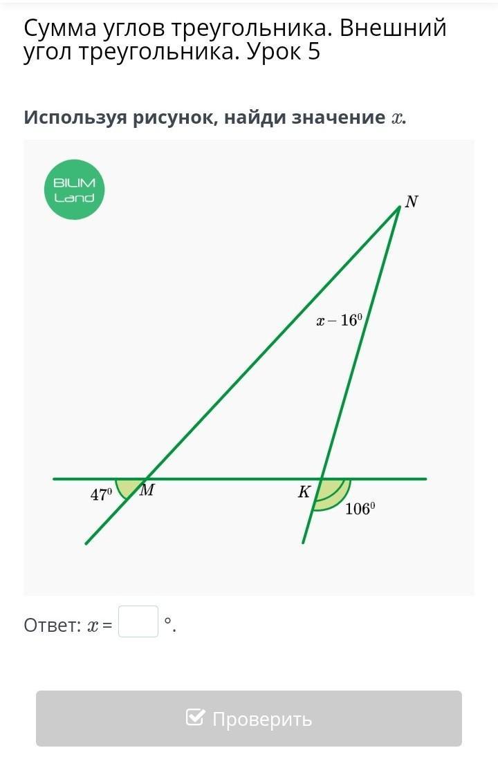 СРОЧНООО ПОЖАЛУЙСТА Сумма углов треугольника. Внешний угол треугольника. Урок 5 Используя рисунок, найди значение x. Ответ: x =°. Назад Проверить