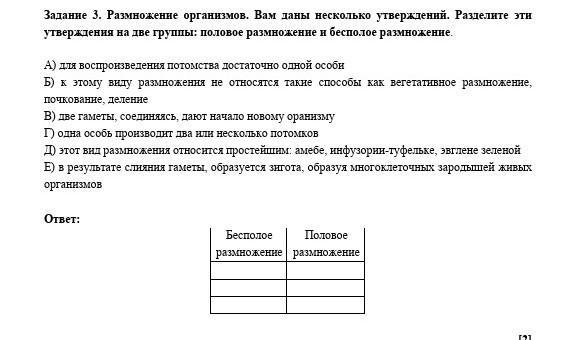 Задание 3. Размножение организмов. Вам даны несколько утверждений. Разделите эти утверждения на две группы: половое размножение и бесполое размножение А) для воспроизведения потомства достаточно одной особи Б) к этому виду размножения не относятся такие способы как вегетативное размножение, почкование, деление В) две гаметы, соединяясь, дают начало новому орaнизму Г) одна особь производит два или несколько потомков Д) этот вид размножения относится простейшим: амебе, инфузории-туфельке, эвглене зеленой E) в результате слияния гаметы, образуется зигота, образуя многоклеточных зародышей живых организмов Ответ: Бесполое размножен ие Половое размножен ие