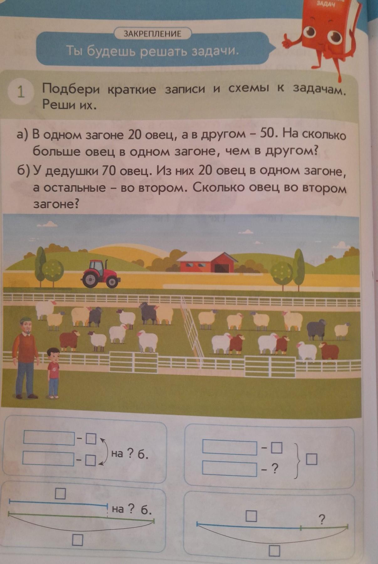 задачи. 1 Подбери краткие записи и схемы к задачам. Реши их. а) В одном загоне 20 овец, а в другом – 50. На сколько больше овец в одном загоне, чем в другом? б) У дедушки 70 овец. Из них 20 овец в одном загоне, во втором. Сколько овец во втором загоне? а остальные