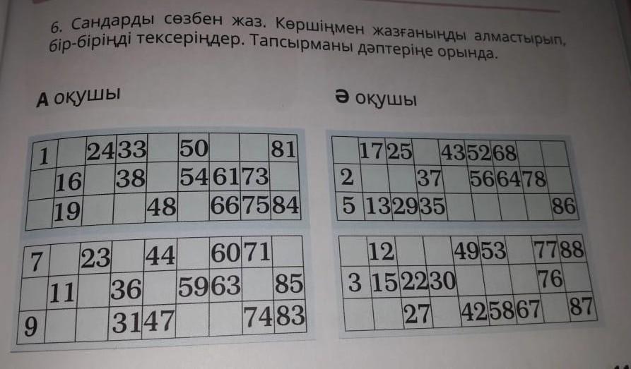 6. Сандарды сөзбен жаз. Көршіңмен жазғанынды алмастырып, бiр-бiрiндi тексеріңдер. Тапсырманы дәптерiне орында.