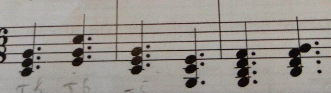 1 аккорд - Т53, 2 аккорд- Т6, 3 аккорд- Т53, 4 аккорд- Т64, 5 аккорд- Д7, 6 аккорд- Д65