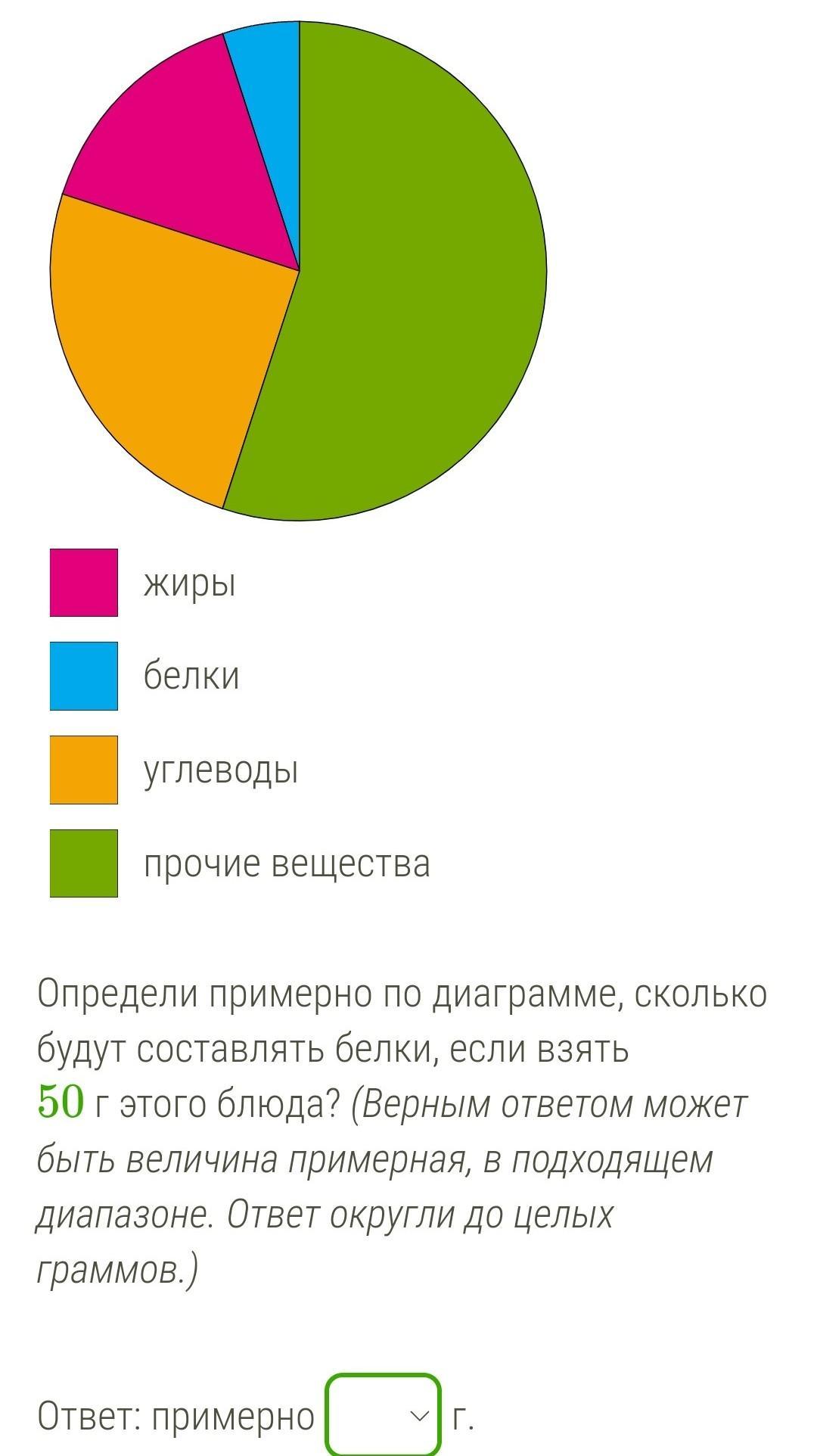Это можно определить с помощью транспортира. Подставив транспортир, получаем 10 градусов. Так как дано 50 грамм блюда, то делим 10 на 2 и получаем 5