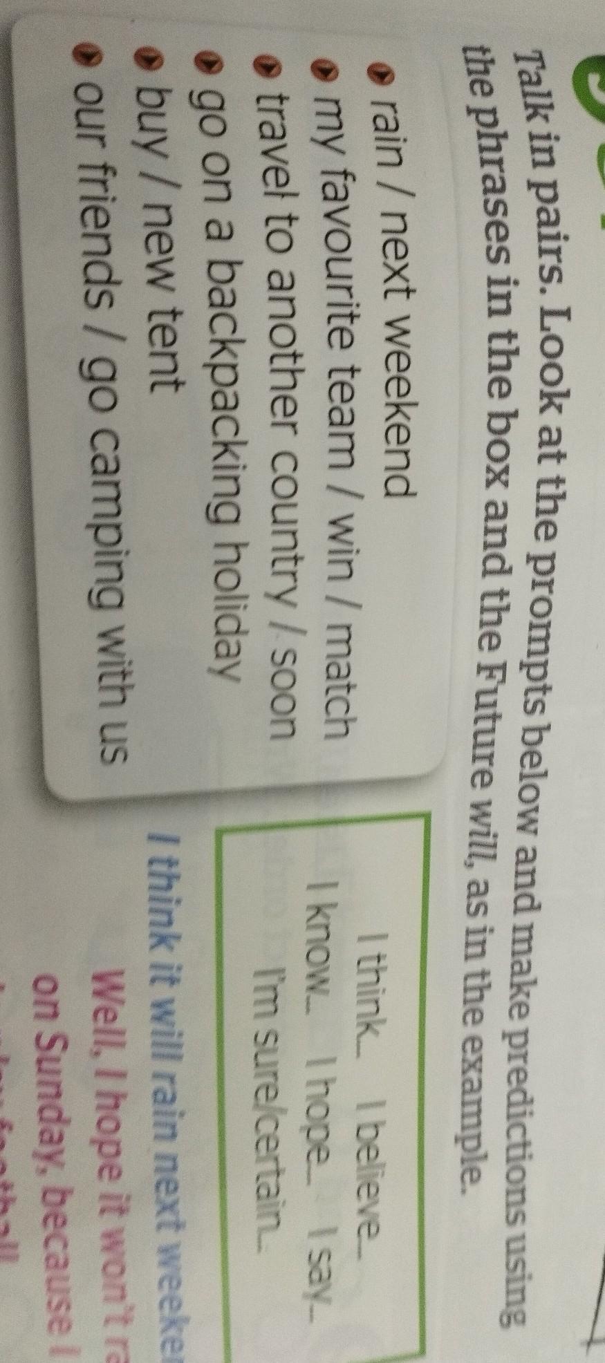Дам 20 баллов Talk in pairs. Look at the prompts below and make predictions using the phrases in the box and the Future will , as in the example .