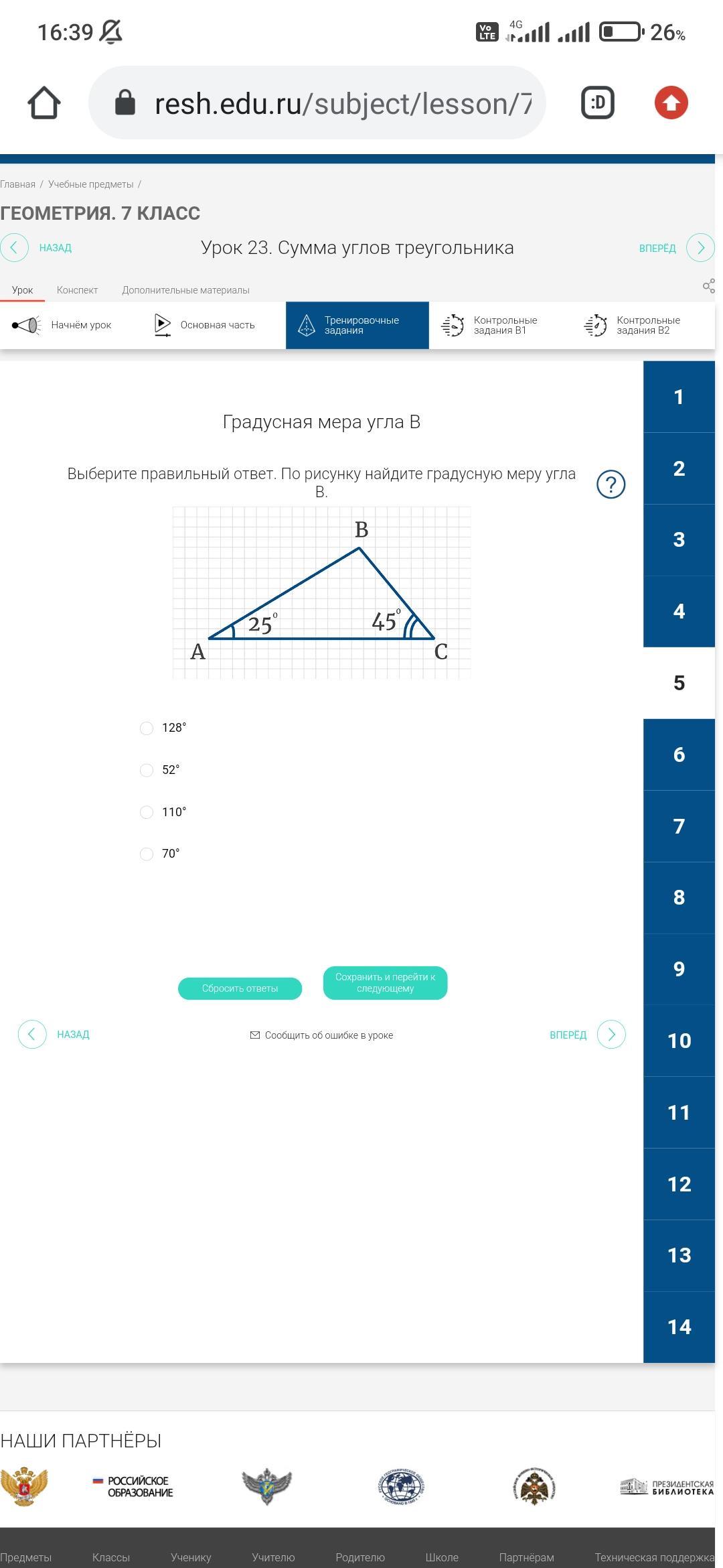 Выберите правильный ответ. По рисунку найдите градусную меру угла В. 128° 52° 110° 70°