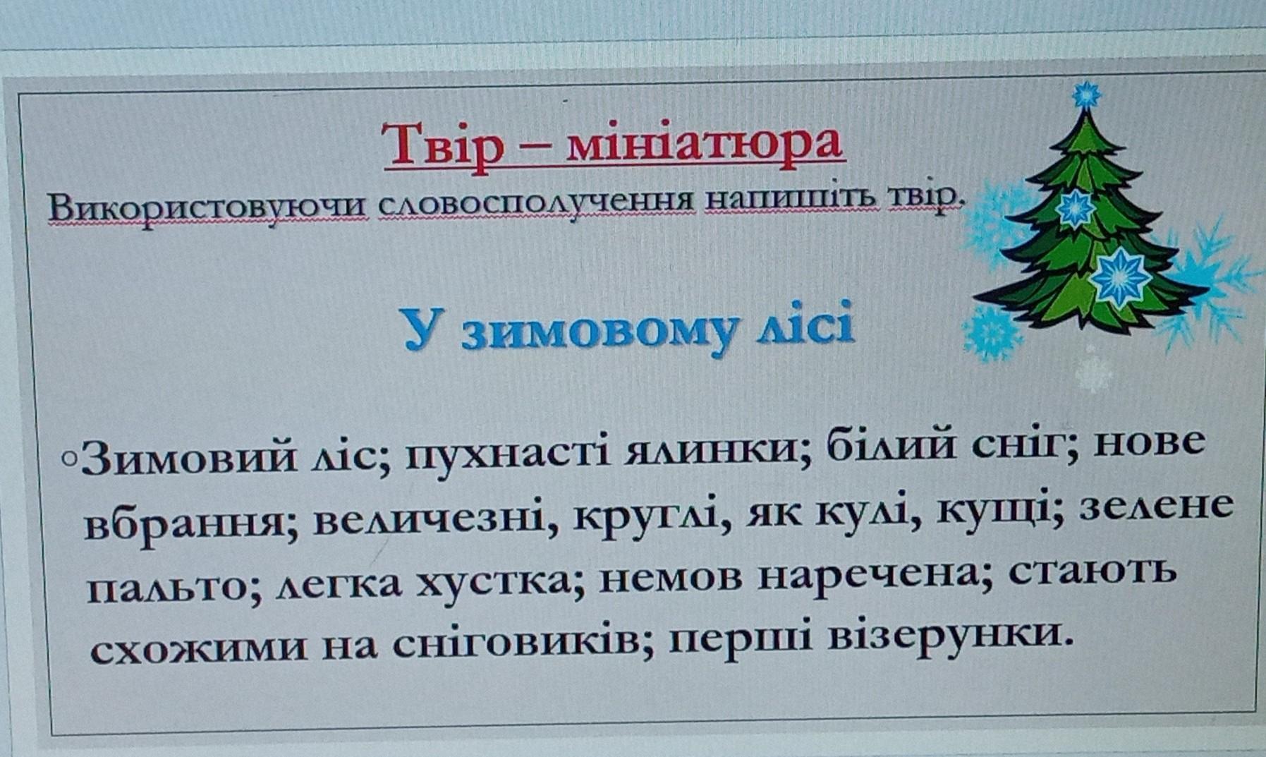 Зимовий ліс заполонили сніжно-білі пухнасті ялинки, немов наречені на видання. Вони із радістю змінили свої зелені пальта. Нове пишне вбрання отримали усі мешканці лісу. Біля могутніх сосен стояли величезні, круглі, як кулі, кущі. Білий сніг укрив усю землю, наче застелив легкою хусткою. Мороз виводить на шибках будинків перші строкаті візерунки. З приходом зими все стає схожим на чудову казку. У лісі так мете, так хурделить, що всі дерева стають схожими на сніговикі, високі сосни - на велитенських, а ялиночки - на маленьких.