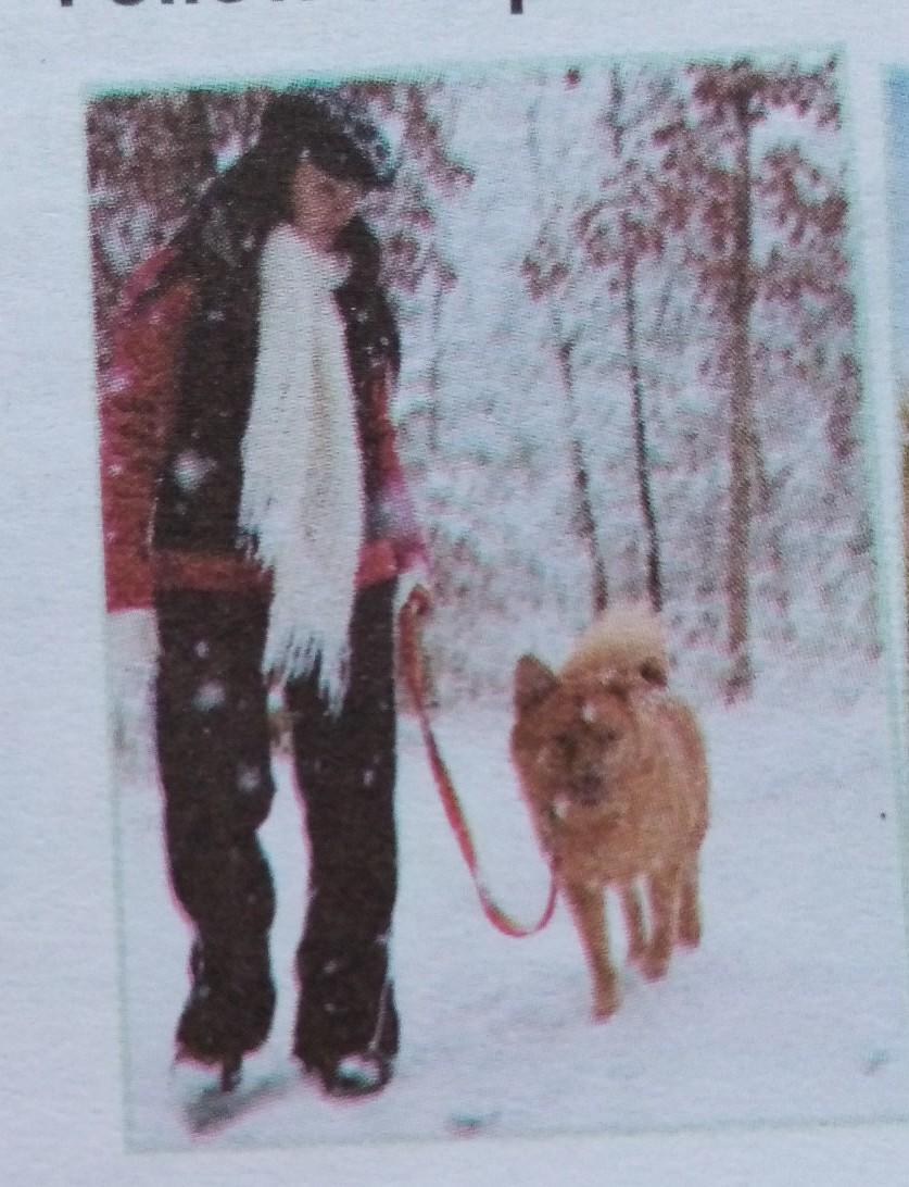 На данной картинке Мужчина вместе с собакой гуляет по лесу, видно что на фотографии была зима, и идёт небольшая метель. Собака выглядит очень красивой, рыженького цвета.