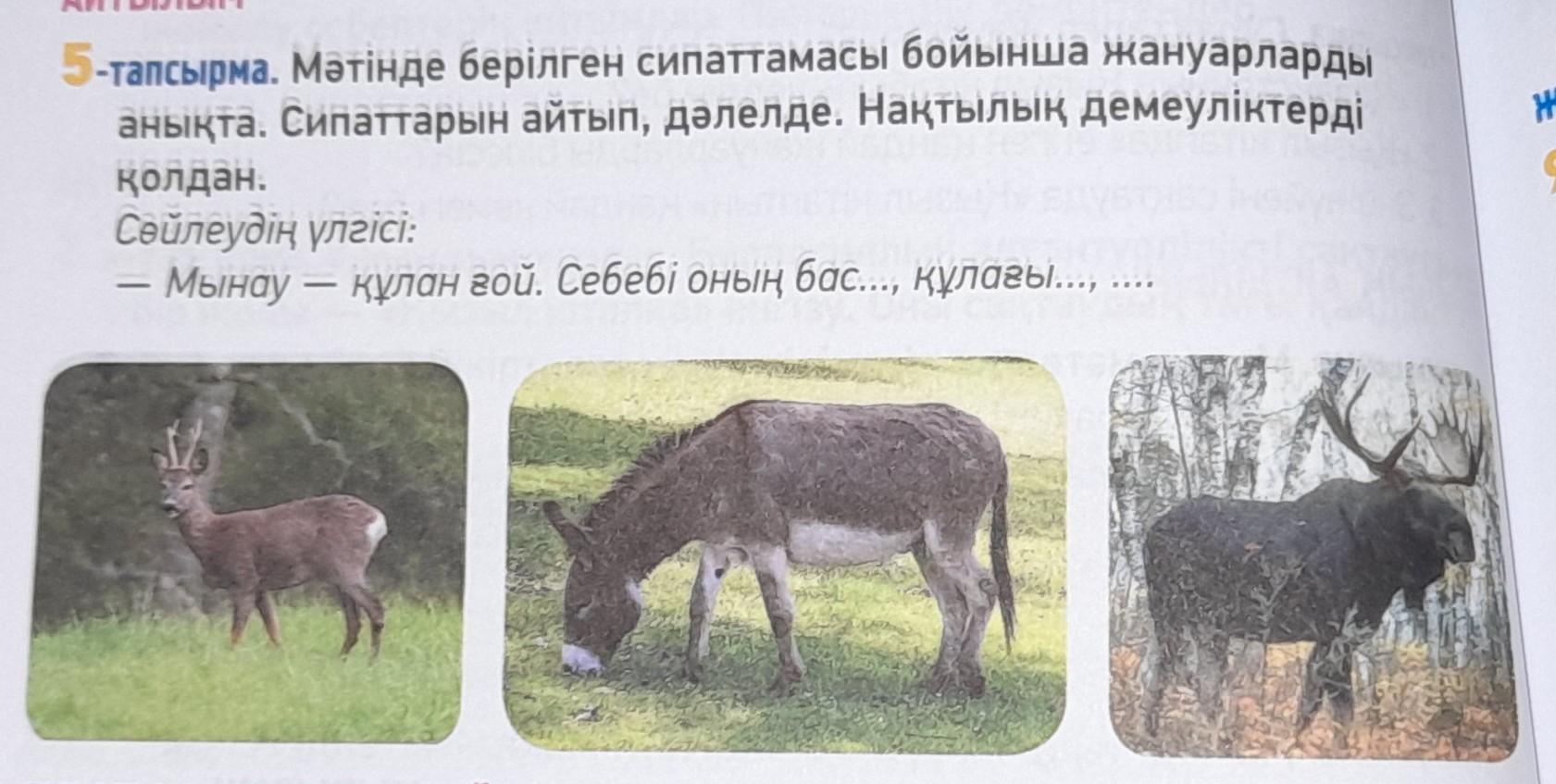 5-тапсырма. Мәтінде берілген сипаттамасы бойынша жануарларды анықта. Сипаттарын айтып, дәлелде. Нақтылық демеуліктерді қолдан. Сөйлеудің үлгісі: - Мынау - құлан ғой. Себебі оның бас..., құлавы...,