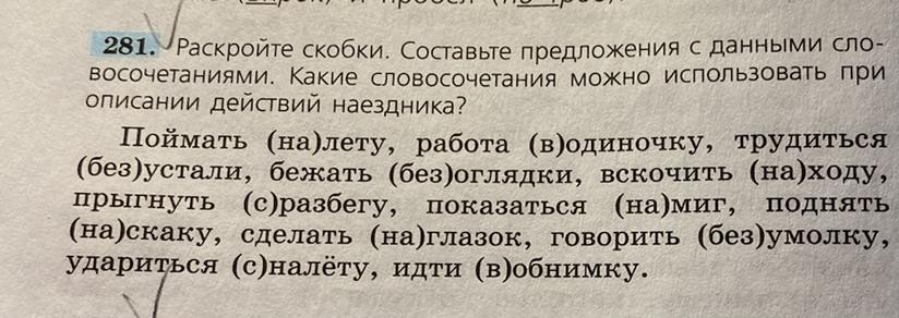 поймать на лету,работу в одиночку,трудиться без устали,бежать без оглядки,вскочить на ходу,прыгнуть с разбегу,показаться на миг,поднять на скаку, сделать на глазок,говорить без умолку,удариться с налёту,идти в обнимку.