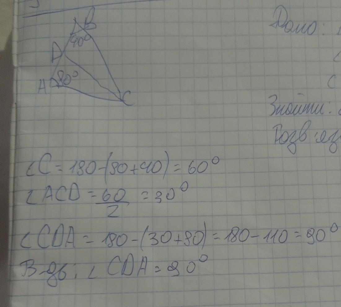 у трикутника ABC кут а 80 градусів кут В 40 градусів бісектриса кута С перетинає сторони АВ у точці D знайти кут CDA