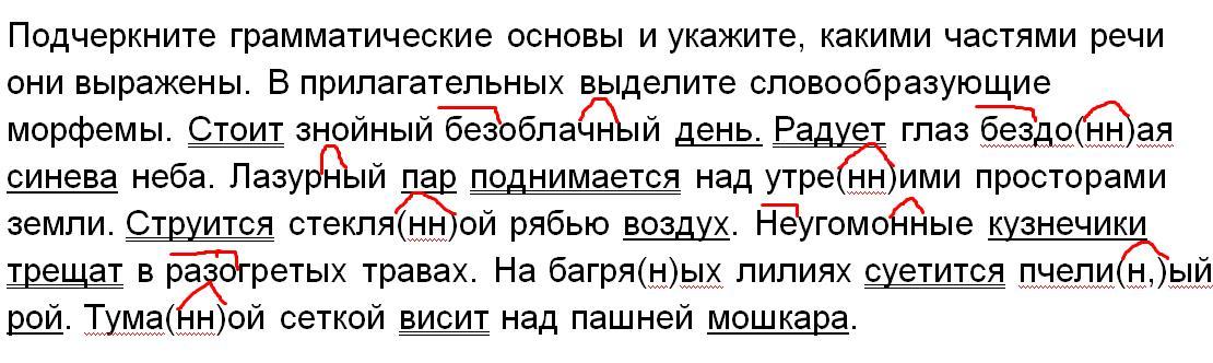 Подчеркните грамматические основы и укажите, какими частями речи они выражены. В прилагательных выделите словообразующие морфемы. Стоит знойный безоблачный день. Раду..т глаз бездо(н,нн)ая синева неба. Лазурный пар поднима..тся над утре(н,нн)ими просторами земли. Струится стекля(н,нн)ой рябью воздух. Неугомонные кузнечики трещат в разогретых травах. На багря(н,нн)ых лилиях суетится пчели(н,нн)ый рой. Тума(н,нн)ой сеткой в..сит над пашней мошкара.