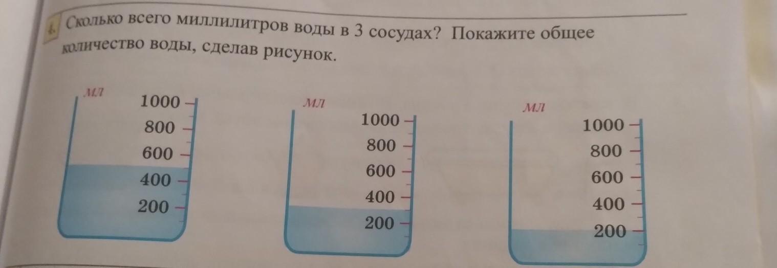 Сколько всего миллилитров воды в 3 сосудах? Покажите общее Количество воды, сделав рисунок.