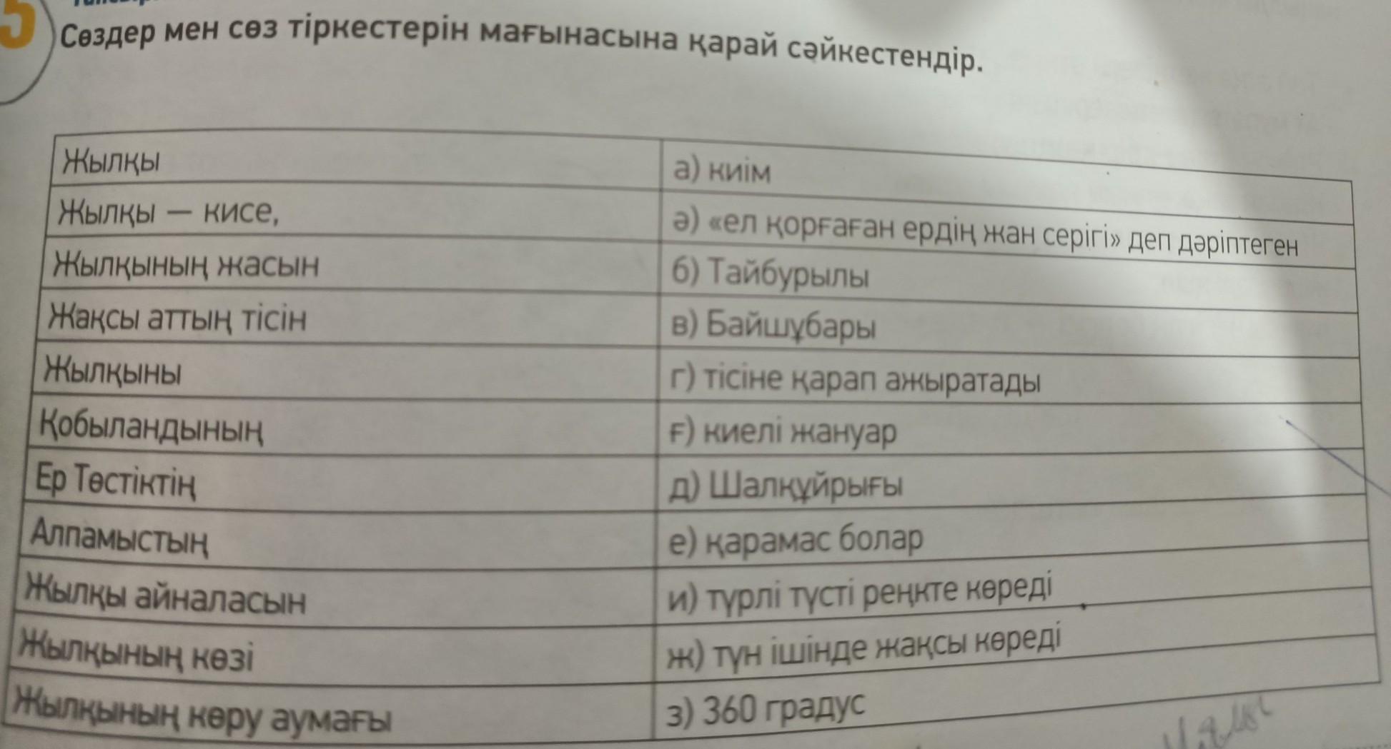Сөздер мен сөз тіркестерін мағынасына қарай сәйкестендір. а) киім Жылқы Жылқы Кисе, Жылқының жасын Жақсы аттың тісін Жылқыны Қобыландының Ер Төстіктің Алпамыстың Жылқы айналасын Жылқының көзі Жылқының көру аумағы Ә) «ел қорғаған ердің жан серігі» деп дәріптеген б) Тайбурылы в) Байшұбары г) тісіне қарап ажыратады ғ) киелі жануар д) Шалқұйрығы е) қарамас болар и) түрлі түсті реңкте көреді ж) түн ішінде жақсы көреді 3) 360 градус da list