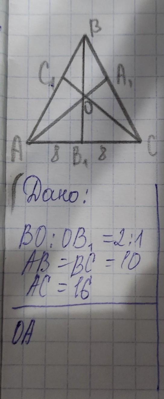 abc равнобедренный bb1 , биссектриса и высота => по теореме биссектрис b1a/ b1c = ab/ ac и ao/oa1 = ab/ba1